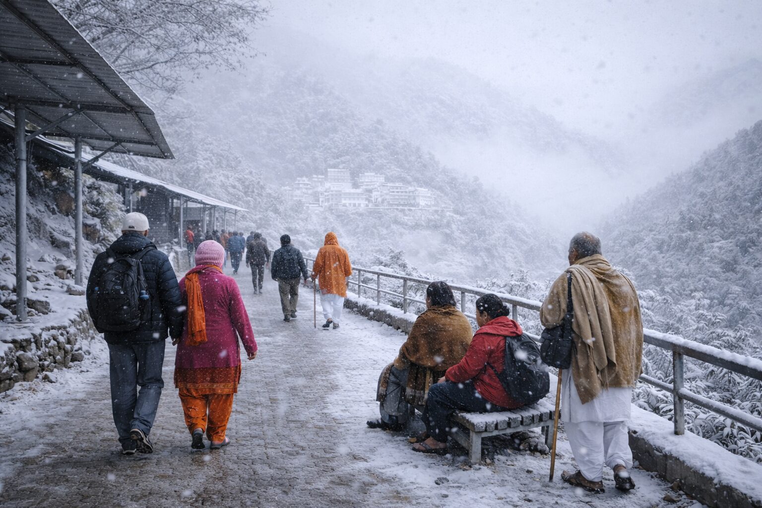 • Trikuta Hills / Upper Trek to Bhawan: Snowfall through the night and into today has blanketed upper routes, making the surfaces slippery and steadily accumulating snow.